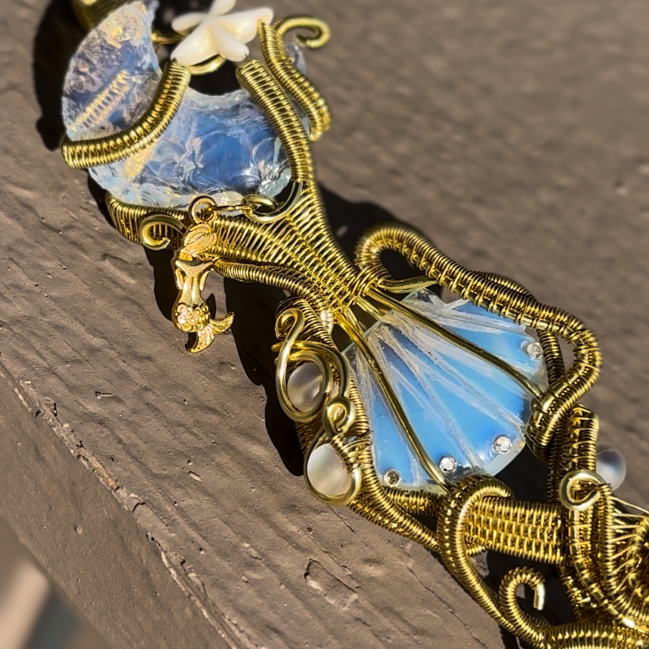 At its heart rests a glowing Opalite seashell, shifting from milky blue to warm sunrise gold depending on the light—just like moonlight dancing across water. 🧜♀️☀️
